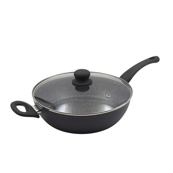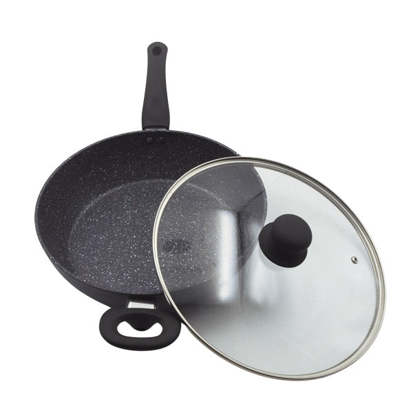 Olla de mármol 28 cm, exterior de aluminio, revestimiento de mármol, tapa de vidrio temperado con salida de vapor, la mejor manera de cocinar sin necesidad de utilizar grasa.