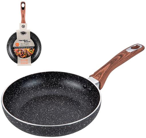 Sartén Hamilton Beach de aluminio de 8 pulgadas, antiadherente con revestimiento de mármol, mango imitación de madera, fondo de inducción. Antes de usarlo por primera vez lávelo con agua y jabón, enjuague y seque bien. Esto removerá cualquier aceite o residuo del fabricante que pueda estar en la superficie del sartén. Para evitar que se raye el interior, no use limpiadores abrasivos que puedan dañar la superficie o utensilios de metal. Use utensilios plásticos, de nylon o de madera. No use en el horno. Nunca deje el sartén sin atender en la estufa | cocina. Nunca deje que el contenido del sartén se consuma o hierva por completo. Cuando cocine, asegúrese que el mango del sartén no sobrepase la orilla de la estufa | cocina. UPC 643700308702.