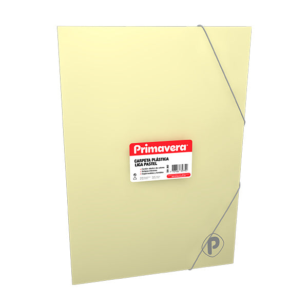 "Carpeta plástica liga en color amarillo pastel, con acabado de alta calidad, colores translúcidos y cordón elástico de colores. Incluye solapas inferiores y total impermeabilidad para proteger tus trabajos escolares. 100% original de Primavera. ¡Cómprala ya!"
