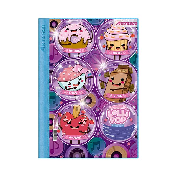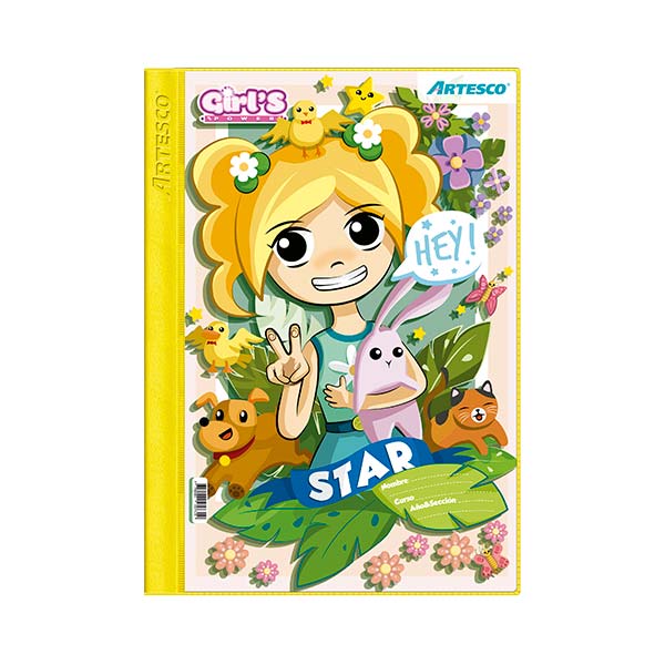 Folder plástico, con 7 diferentes y variadas portadas, bolsillos en el interior y porta bolígrafo, fastener de metal inoxidable, incluye dos etiquetas para colocar el nombre, sección y curso.