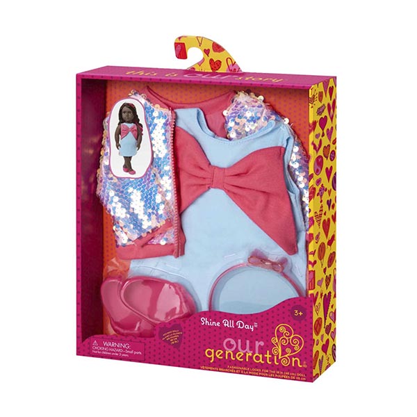 Haz que cada día sea brillante con el conjunto Shine All Day de Our Generation. Incluye una elegante chaqueta bomber de lentejuelas con cierre frontal, un vestido azul claro con un gran lazo rojo, una diadema a juego y un par de zapatos rosados, creando un look impecable para actividades al aire libre. Diseñado para muñecas de 46cm, es ideal para niñas de 3años en adelante, promoviendo la creatividad, el juego de moda y la autoexpresión.