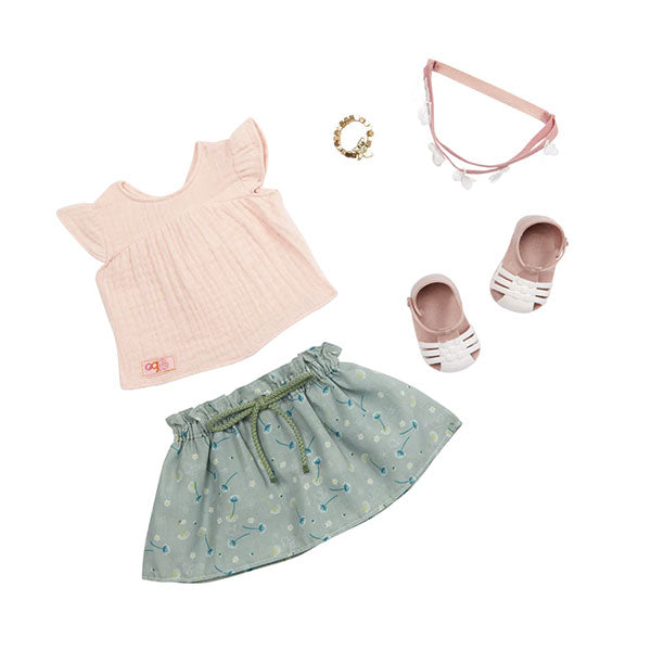 Brilla bajo el sol con el conjunto “All Aflutter”. Incluye una blusa rosa sin mangas con pliegues delicados, falda verde menta con mariposas, sandalias blancas, diadema rosa y pulsera dorada. Ideal para muñecas y niñas a partir de 3 años que aman la moda y los días llenos de color.