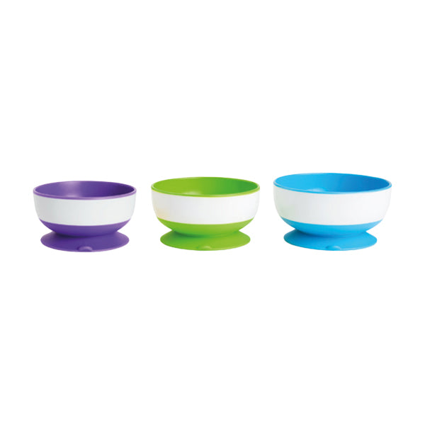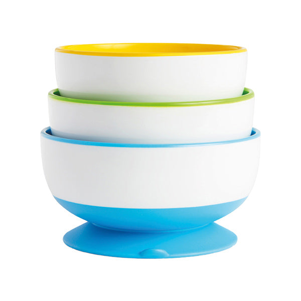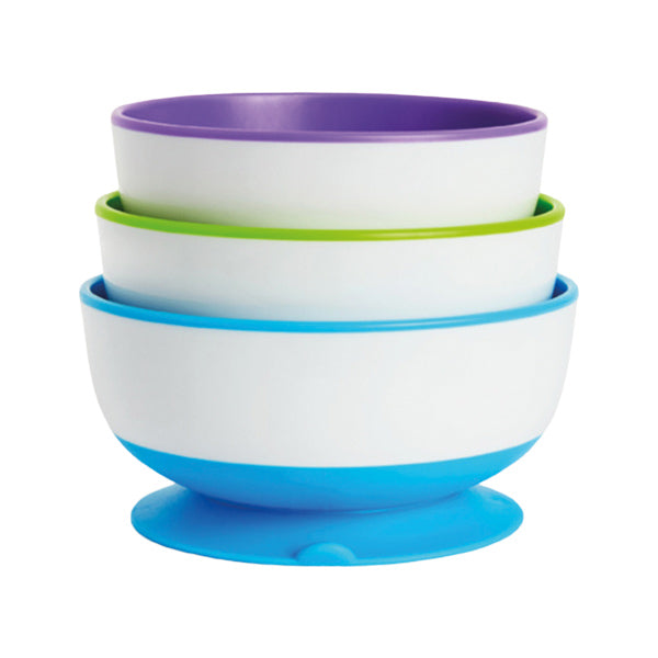 El juego incluye (3) cuencos de succión de diferentes tamaños. La base de succión fuerte ayuda a prevenir desorden y derrames. Las pestañas de liberación rápida en cada base de succión permiten una fácil extracción por parte de los padres. La base de succión más grande crea una mejor sujeción. Apto para lavavajillas en microondas y rejilla superior, sin BPA. 6+ meses.