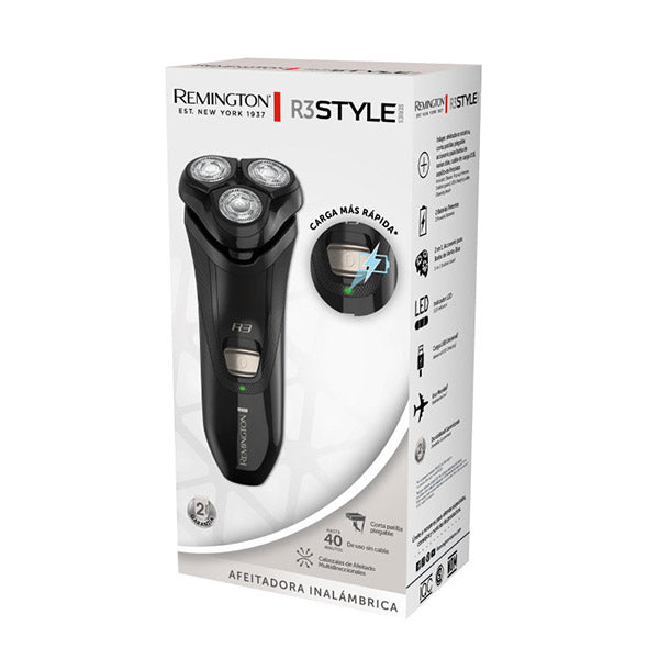 Afeitadora Rotativa Remington Style Series R1: Logra un afeitado perfecto con cuchillas flotantes de acero inoxidable Dual Track para una cobertura total y corte preciso. Ofrece 30 minutos de uso inalámbrico tras 8 horas de carga. Ideal para uso en seco o húmedo, con cortador de patillas plegable e indicador LED para mayor precisión. Incluye cepillo limpiador y 1 año de garantía.