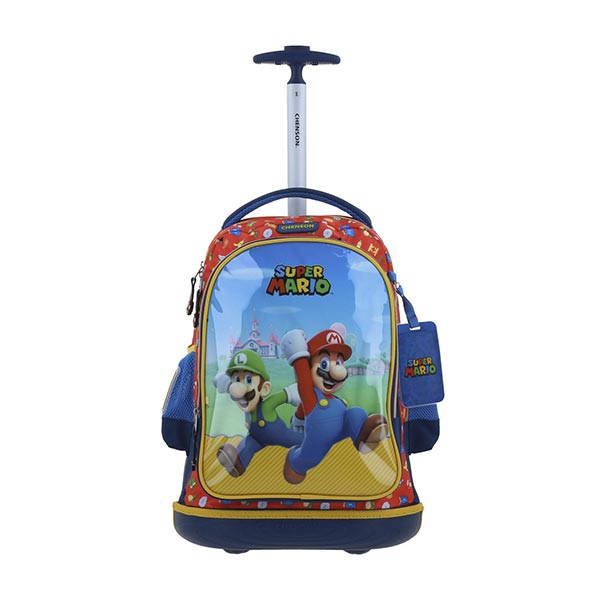 Viví aventuras únicas con la mochila Chenson de Mario Bros en azul. Cuenta con panel texturizado, bolsillos funcionales, doble poste retráctil y ruedas de gel para un transporte cómodo y divertido. ¡Llevá la diversión a todas partes!