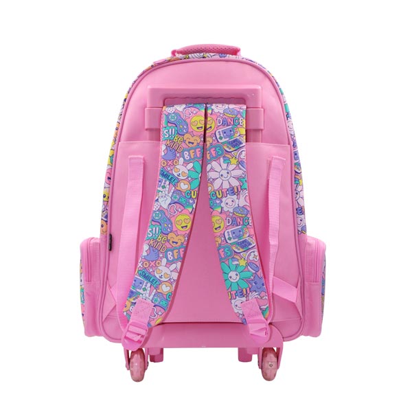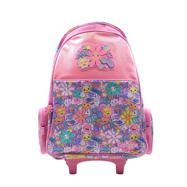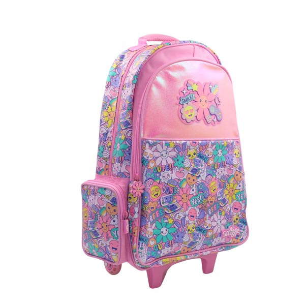 Salveque con ruedas Smile, práctico y colorido, ideal para niños. Diseño alegre con sistema de ruedas y manija retráctil para fácil transporte. Amplio espacio interior, bolsillo frontal y compartimento lateral para botella. Perfecto para la escuela o viajes.