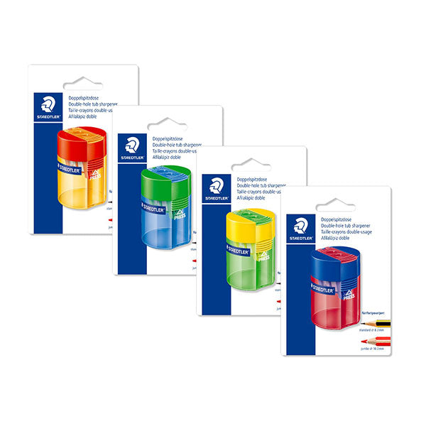 Presentado en blíster, cuenta con 2 orificios para diferentes tamaños de lápices y una tapa con bisagra que evita derrames de virutas. Incluye un cierre de seguridad para evitar aperturas accidentales. Producto surtido, disponible en varios colores.