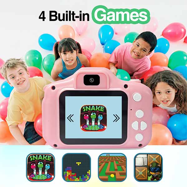 Capturá fotos de hasta 40 MP y videos HD 1080P con cámara dual y zoom digital 8X. Incluye tarjeta TF de 32 GB, efectos, filtros, juegos, reproductor MP3 y batería recargable de 400 mAh. Con puerto USB-C, micrófono, altavoz y funda de silicona. Disponible en azul y rosa. Ideal para pequeños creadores.