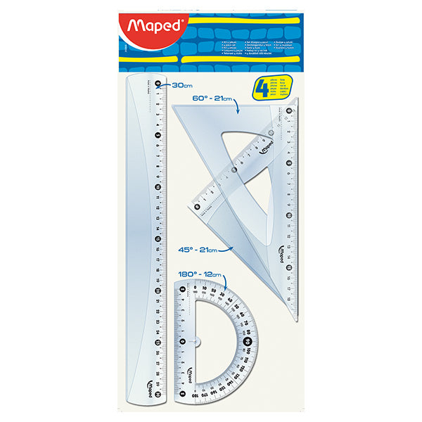 Juego de geometría, de 30 centímetros, contiene 4 piezas, marcado de alta calidad: graduaciones impresas con UV. Con centímetros y pulgadas. Marca Maped.