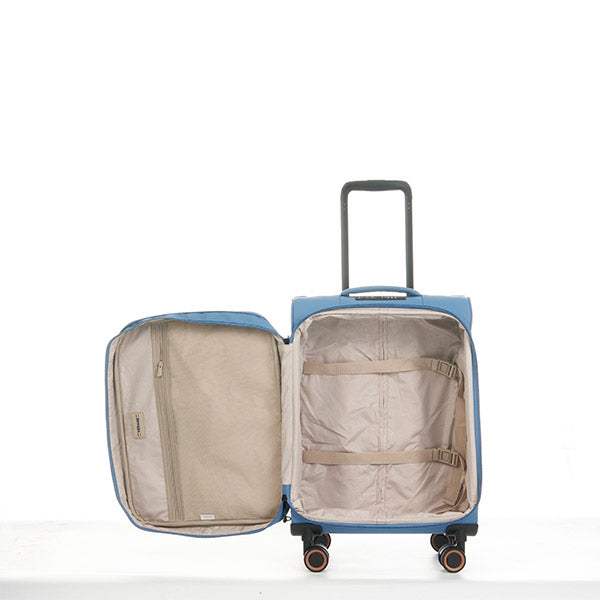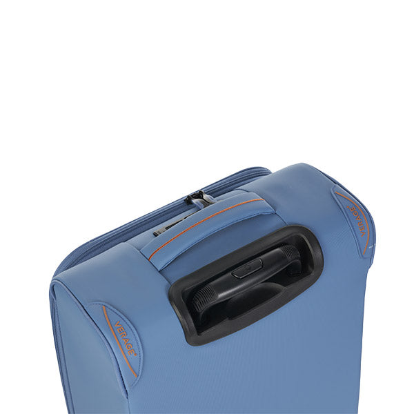 Maleta suave Verage 18" color celeste, liviana y resistente. Perfecta para viajes cortos, con compartimentos prácticos que facilitan la organización. Diseño moderno y cómodo para transportar con facilidad.