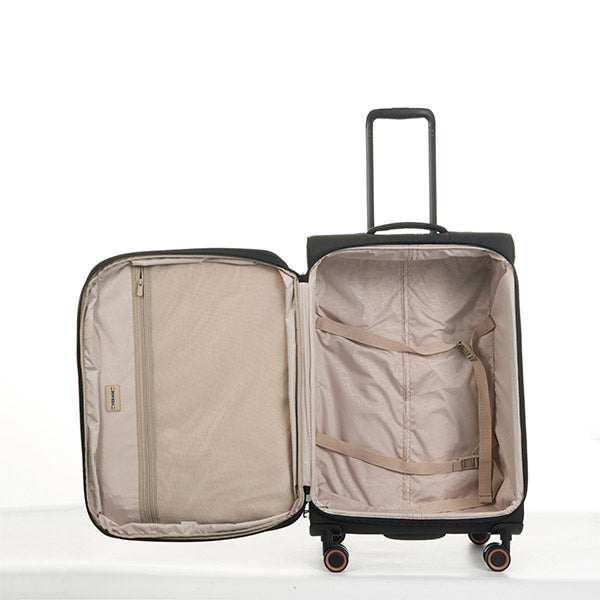 Maleta suave de 24" color negra marca Verage. Ideal para viajes medianos, combina resistencia y ligereza. Cuenta con ruedas giratorias, asa telescópica y compartimentos organizadores para mayor comodidad.
