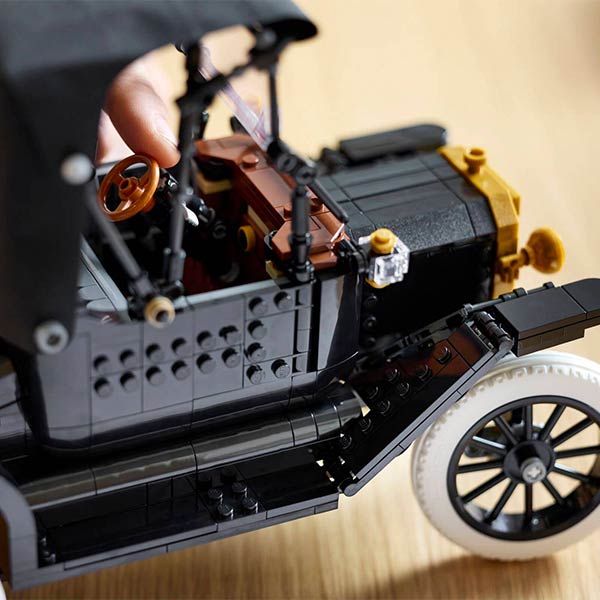 Rinde homenaje a un icono de la historia del automóvil con el kit LEGO® Icons Ford Model T (11376) para adultos. Esta réplica del vehículo de la década de 1910 cuenta con capota de tela plegable, parabrisas dividido abatible y una única puerta, situada en el lado del acompañante. Incluye un maletero que se abre y un detallado habitáculo con sistema de dirección. Levanta el asiento para acceder al depósito de carburante y también los paneles del capó para ver el motor. Luego acciona la manivela para que gire el ventilador. Con carrocería negra, detalles dorados y llantas altas de radios con neumáticos estrechos de goma blanca, este modelo de coche antiguo es una elegante pieza de exposición para tu hogar. Este extraordinario modelo es un excelente regalo para amantes de los coches clásicos. Descubre la inspiradora gama de proyectos LEGO creativos (a la venta por separado) diseñados para adultos y construye de forma más inteligente con la app LEGO Builder. El set contiene 1060 piezas.
