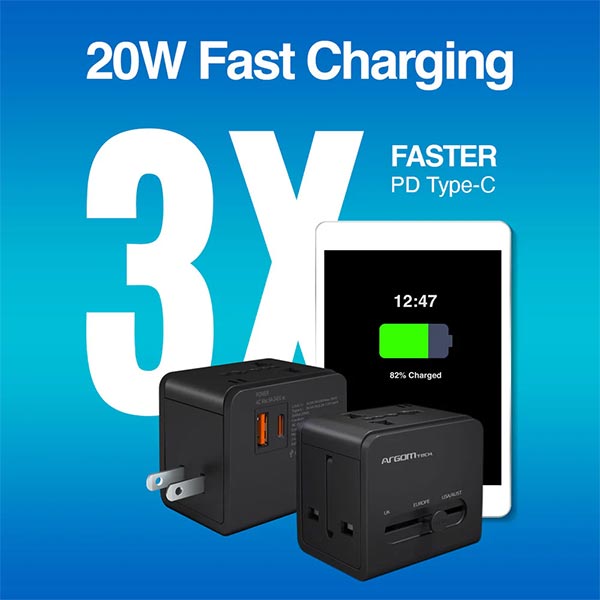 Adaptador de viaje universal con 4 enchufes internacionales – Compatible en más de 150 países. Incluye puertos USB QC3.0 (18W) y PD tipo C (20W) para carga rápida. Seguridad con fusible, persianas y sistema de bloqueo. Indicador LED y diseño compacto ideal para viajeros.