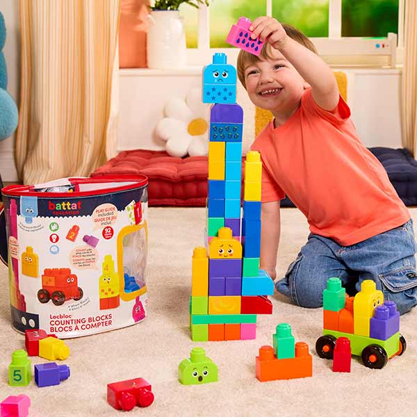 Bloques Contadores Locbloc de Battat Education invitan a explorar la creatividad desde temprana edad. Incluye bloques de colores y tamaños variados, piezas con ruedas para construir vehículos y bloques con expresiones faciales que fomentan el juego imaginativo y las habilidades socioemocionales. Viene con tarjetas y pegatinas educativas para aprender números, colores y conteo. Ideal para niños desde 12 meses, combina diversión y aprendizaje en cada construcción.