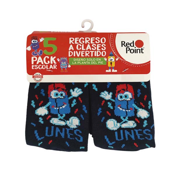 Calcetín escolar para niño color azul con estampado de días de la semana. Composición: 78% algodón, 19% poliéster, 3% spandex. Talla: 8.5. Incluye 5 pares. Perfecto para el uso diario, cómodo y resistente.