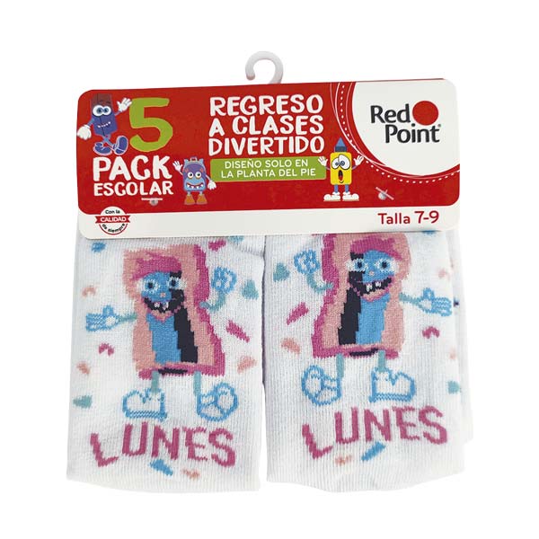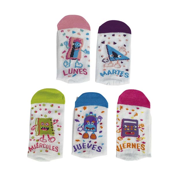 "Calcetín escolar para niña en color blanco con estampados de días de la semana. Confeccionado con 78% algodón, 19% poliéster y 3% spandex para un ajuste cómodo y duradero. Tallas: 3-5. Incluye 5 pares. ¡Ideales para el regreso a clases!"