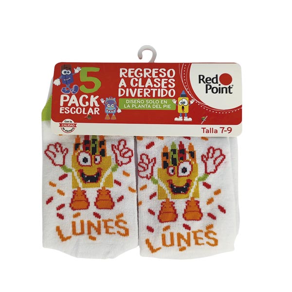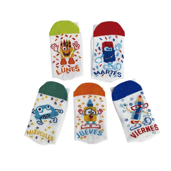 Calcetín escolar para niño color blanco con estampado de días de la semana. Composición: 78% algodón, 19% poliéster, 3% spandex. Tallas: 5-7. Incluye 5 pares. Ideal para el uso diario, cómodo y duradero.