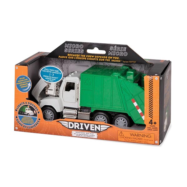 ¡Pon en marcha tu misión ecológica con el Micro Camión de Reciclaje de Driven by Battat! Este camión verde repleto de detalles realistas incluye puertas y capó que se abren, luces funcionales y sonidos auténticos de motor y bocina. Su cargador gira con solo presionar un botón, y el contenedor trasero se inclina para vaciar los reciclables. Recomendado para niños de 3 años en adelante, es ideal para fomentar el juego de roles y la imaginación. Incluye 3 pilas AG13 para que puedas jugar desde el primer momento.