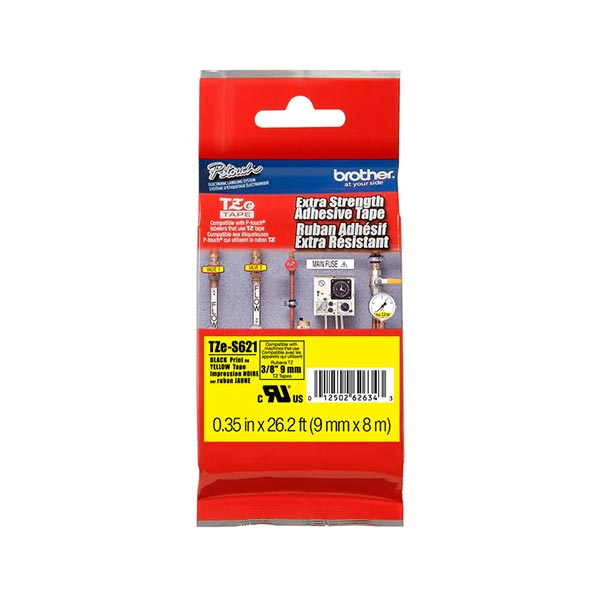 Cinta etiquetadora de 9 milímetros x 8 metros, color negro, fondo amarillo, ideal para la casa u oficina. Estas cintas con adhesivo extra fuerte se pueden utilizar en todas las maquinas TZ. Marca Brother.