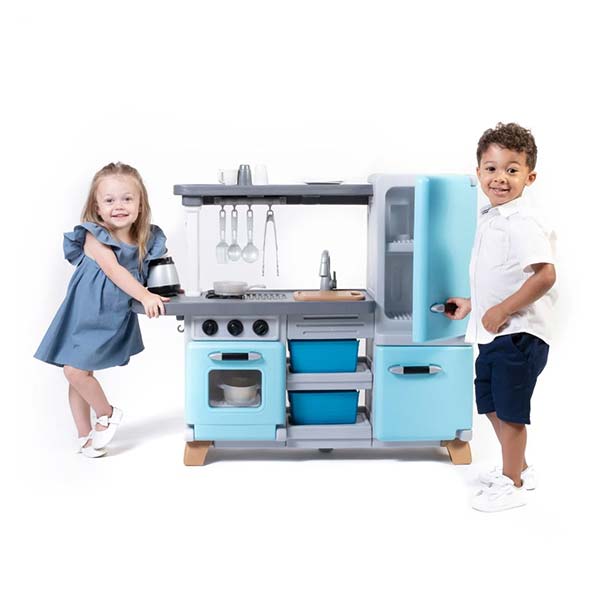 Cocina de juguete Cooking Time de Step2, con diseño moderno de estilo vintage. Incluye refrigerador, congelador, fregadero, horno, estufa, reloj y más, además de set de 25 accesorios. Con placa electrónica con luces y sonidos para un juego realista. Ideal para fomentar creatividad, juego social y habilidades motoras en niños.
