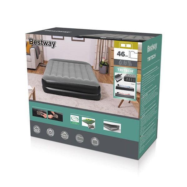 Cama de aire tamaño Queen, diseñada para brindar comodidad superior, estabilidad y facilidad de uso para hasta 2 personas. Su bomba eléctrica integrada permite un inflado rápido en solo 4 minutos, mientras que la estructura interna Tritech™ y la construcción con vigas en I garantizan firmeza y durabilidad. La superficie flocada y la almohada incorporada proporcionan una experiencia de descanso más confortable.