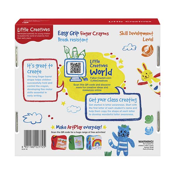 La forma grande y gruesa es fácil de sostener para las manos pequeñas. El diseño único de los dedos fomenta un agarre ergonómico y ayudan a mejorar la motricidad fina, así como la coordinación ojo-mano. Los pigmentos borrables crean un entorno de aprendizaje sin preocupaciones. Los colores brillantes de alta calidad cubren fácilmente grandes áreas La fórmula rica de crayón no es tóxica y es segura para los más pequeños. Se elimina de la mayoría de las telas para mayor tranquilidad y fácil limpieza.