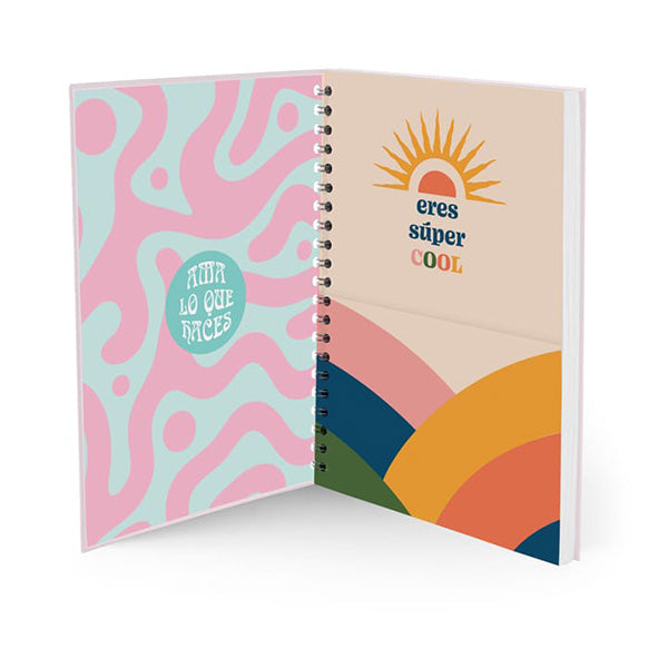 Cuaderno espiral pasta dura con 12 portadas con diseños femeninos juveniles con tintas fluorescentes, 80 hojas, contraportadas impresas, stickers, separador de bolsa. Las imágenes son de referencia, los colores y diseños podrían variar según disponibilidad. Puede recibir uno de los estilos mostrados.