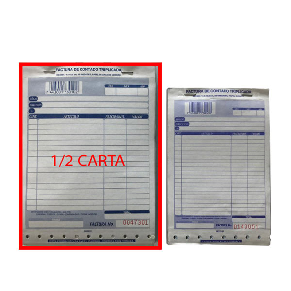 Factura de 1/2 triplicada bond con papel químico.