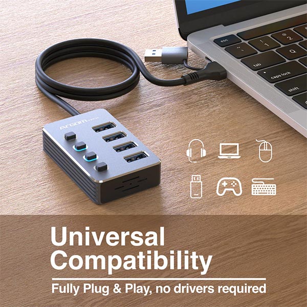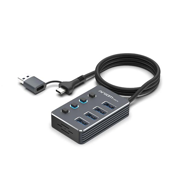 Hub USB 3.0 4 Puertos con Conectividad Tipo-C/USB – Disfrutá de transferencia rápida de datos a 5 Gbps con este hub 2 en 1 que incluye 4 puertos USB 3.0 con interruptores individuales, puerto de alimentación externa tipo C y diseño en aluminio resistente. Plug & play, sin necesidad de drivers. Ideal para ampliar tu conectividad al instante.