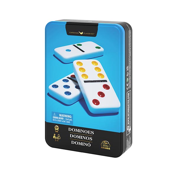 Dominó clásico Spin Master caja de metal, piezas de gran calidad, de plástico duro, grueso y resistente, 28 fichas de dominó para niños de 6 años y ficha de inicio. Práctico estuche de metal. Incluye instrucciones que pueden no estar en español. Diversión para toda la familia.