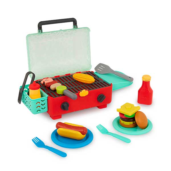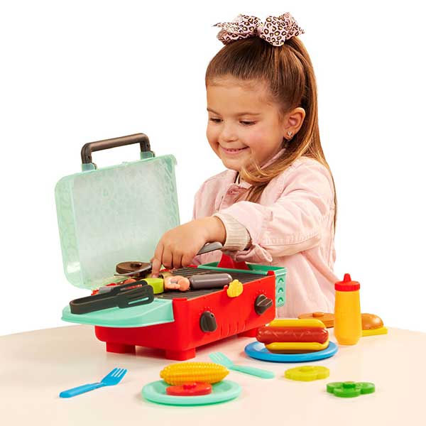 Divertido set portátil de 26 piezas que enciende la imaginación: parrilla con tapa, perillas "clicables", espátula, pinzas, brocheta con camarones y verduras, mazorca, hot-dog, ingredientes de hamburguesa apilables, dos platos y botellas de condimentos. Gracias a su almacenamiento interno, ¡todo cabe dentro de la BBQ para transportar y guardar fácilmente!