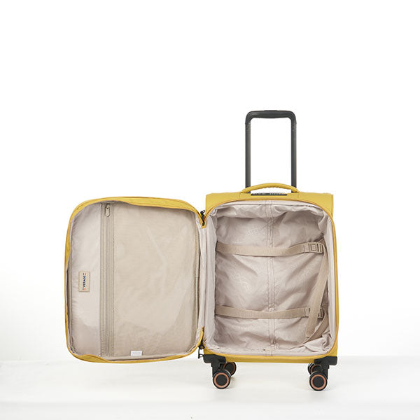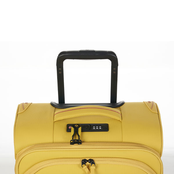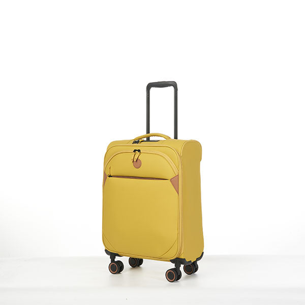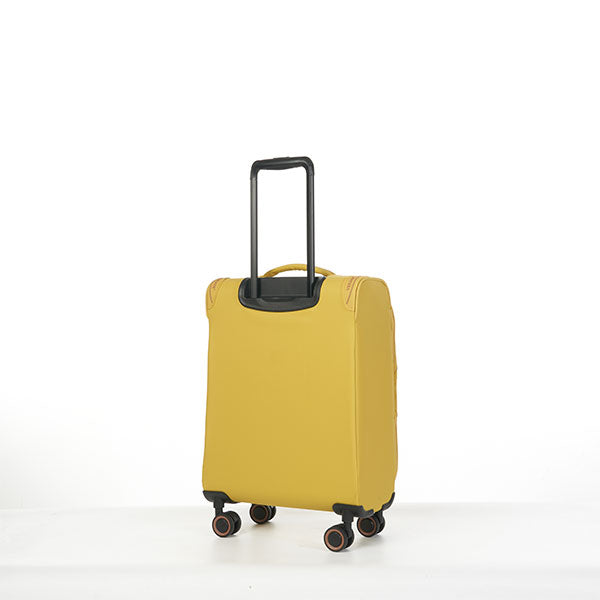 Maleta suave de 18" color amarilla marca Verage. Compacta, ligera y resistente, ideal como equipaje de mano para viajes cortos. Incluye ruedas giratorias, asa telescópica y compartimentos internos para mantener todo en orden.