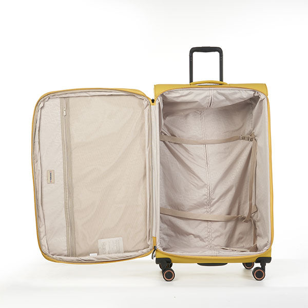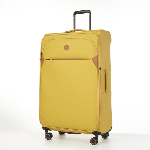Maleta suave de 28" color amarilla marca Verage. Diseño amplio y liviano, perfecta para viajes largos. Incluye ruedas giratorias, asa retráctil y compartimentos internos para mayor organización.