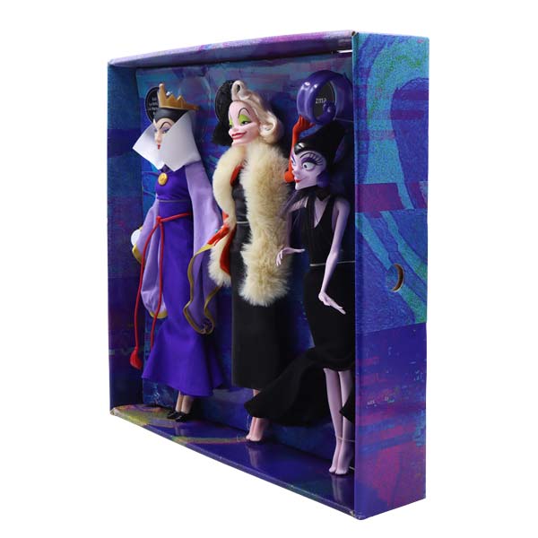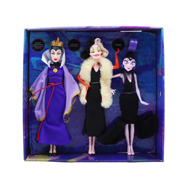 Celebra los 100 años de Disney con este paquete de 3 muñecas inspiradas en algunas de las villanas más populares de las películas clásicas de Disney: la Reina Malvada de "Blancanieves y los siete enanitos", Cruella De Vil de "101 dálmatas" e Yzma de "Las locuras del emperador". Cada muñeca villana luce su estilo característico con vestimenta idéntica a la de la película y expresiones maravillosamente malvadas. Las muñecas no se mantienen de pie por sí solas. Los colores y decoraciones pueden variar. Perfecto para coleccionistas y fans de Disney.