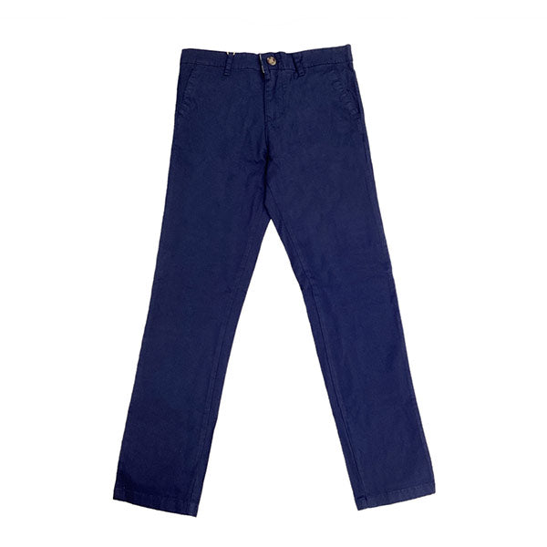 Pantalón escolar azul para niño, confeccionado con 97% algodón y 3% lycra para mayor comodidad y flexibilidad. Disponible en tallas 2, 4, 6 y 8, ideal para el uso diario escolar."