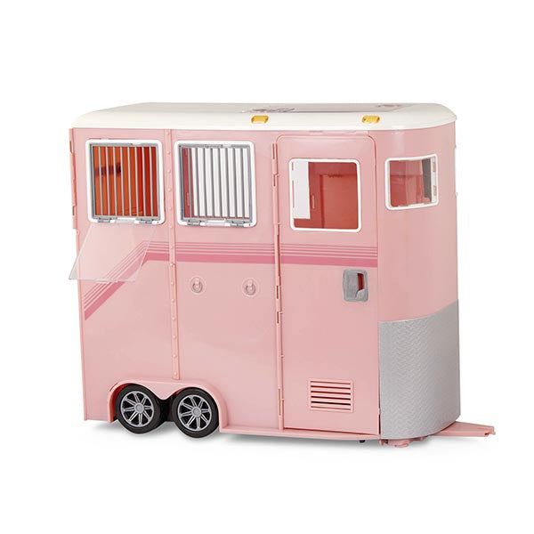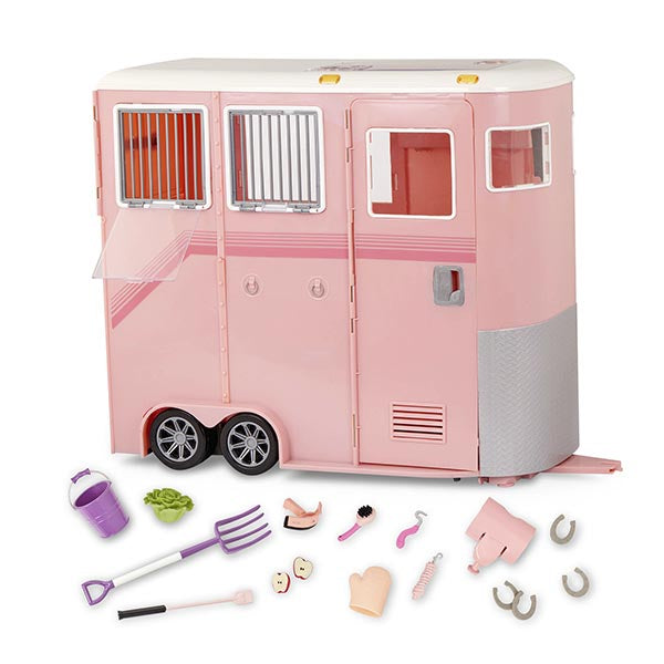 ¡Prepárate para viajar con estilo con el remolque para caballos Our Generation Mane to Travel! Este accesorio ecuestre es perfecto para muñecas de 18 pulgadas y sus amigos caballos. Con ruedas giratorias y detalles realistas, ¡se abre para revelar una variedad de características divertidas, como ventilación, puertas y ventanas! En su interior, encontrarás estantes, ganchos y áreas de almacenamiento para exhibir las piezas de juego incluidas. Viene con cuerdas, cepillos y más para cuidar a los caballos. ¡Compatible con la mayoría de muñecas de 18 pulgadas y caballos de 20 pulgadas! Las muñecas y caballos se venden por separado.