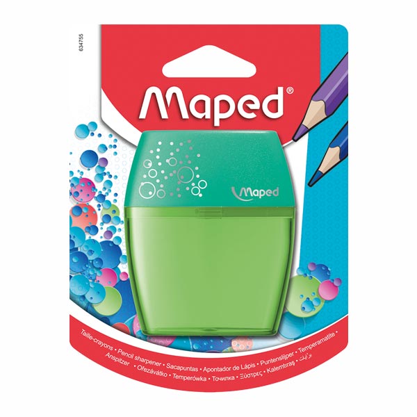Sacapuntas de tres colores disponibles rosa, verde y azul. El sacapuntas Shaker, muy práctico con su gran capacidad de reserva, de 2 orificios, para sacar punta a lápices gruesos y delgados, forma ergonómica para una buena sujeción.
