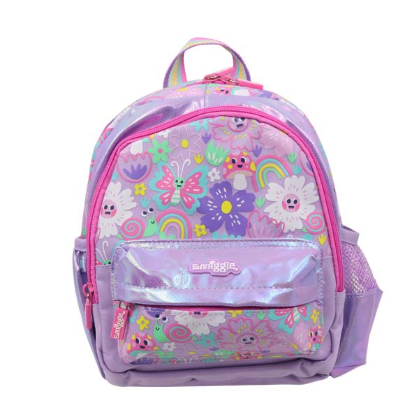 Salveque infantil lila mariposa, con detalles metálicos que brillan con estilo. Diseño delicado y funcional, incluye bolsillo frontal, compartimento lateral para botella y tirantes ajustables. Ideal para niñas, perfecto para la escuela, guardería o paseos.