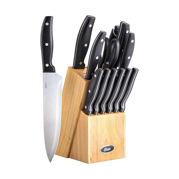 Set de cuchillos de cocina con 15 piezas esenciales: incluye cuchillo de chef, Santoku, pan, utilitario, pelador, 6 cuchillos para carne, tijeras, afilador y bloque de madera. Ideal para preparar como un profesional.