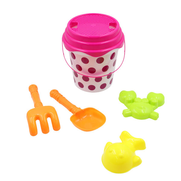 Set de juguetes plásticos para niños. Cubeta con accesorios para disfrutar con arena, incluye cubeta y 4 accesorios. Edad recomendada para mayores de 3 años.