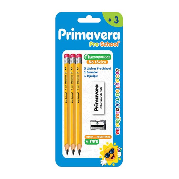 Set 3 lápices pre-school, borrador y sacapuntas trae todo lo necesario para crear y borrar con estilo. Los lápices tienen diseño sencillo, el sacapuntas afila con precisión y el borrador elimina todos los errores. ¡Hazlo tuyo hoy mismo! Solo con Primavera.